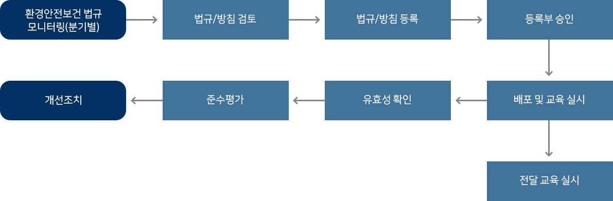 국내, 국외 환경안전보건 관련 법규 준수를 통하여 지속적인 준법 경영활동을 한다.